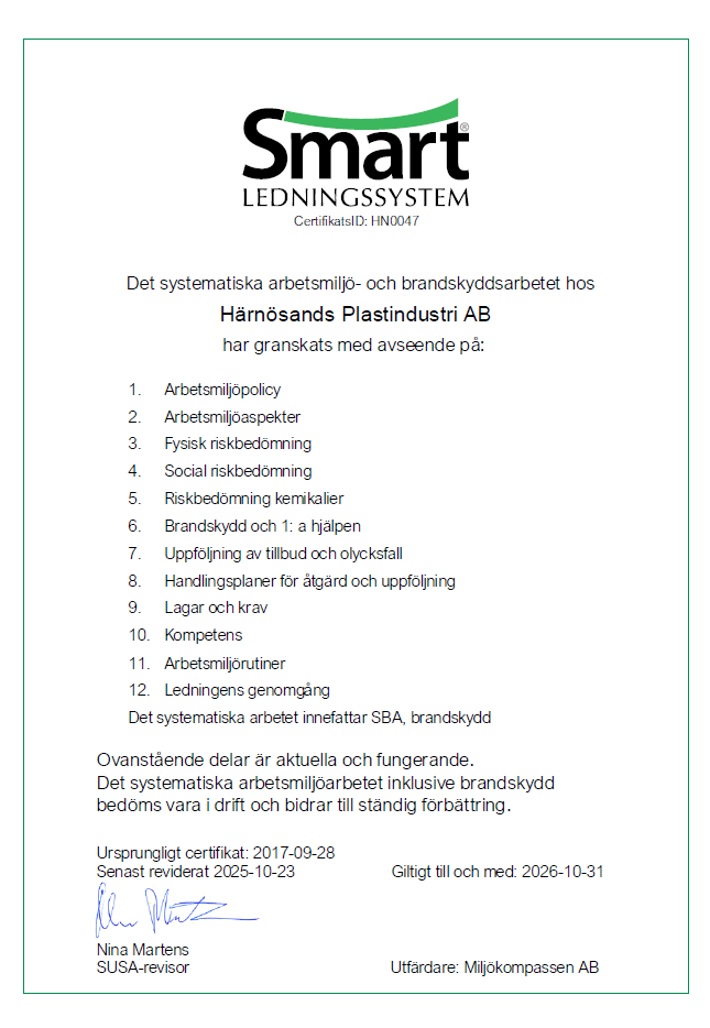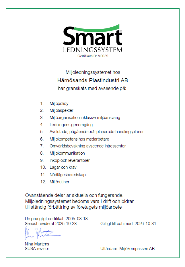 Tillsammans med våra kunder arbetar Härnösands Plastindustri AB mot höga miljömål!